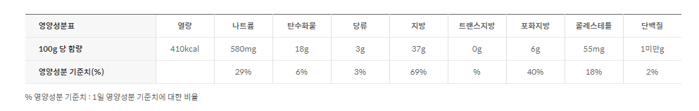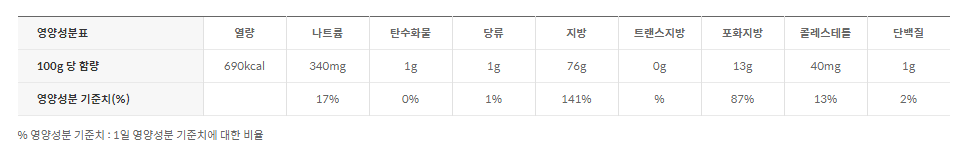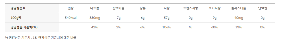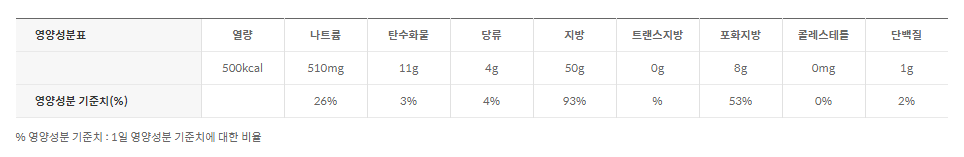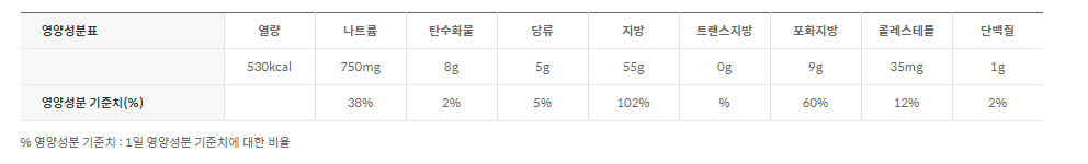 - 고소한 맛은 그대로 유지하면서 기름과 지방 함량을 줄여 칼로리를 40% 낮춘 마요네즈